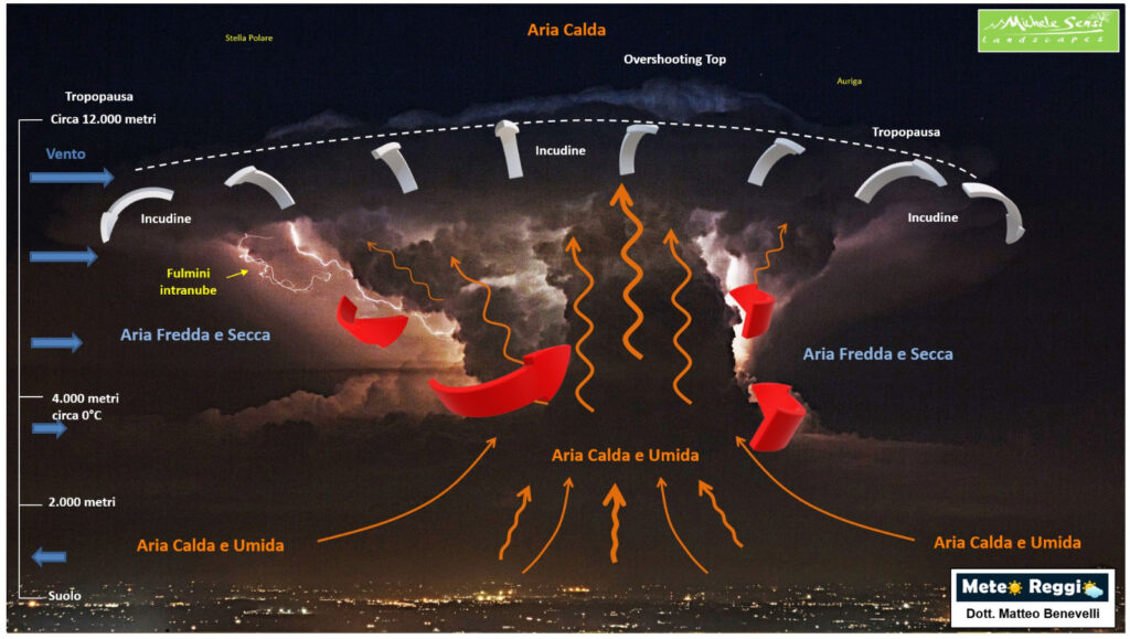 Grazie alla nostra immagine, è possibile vedere in un unico colpo d’occhio l’intero processo: l’ascesa dell’aria calda, la crescita verticale, il contatto con la tropopausa, l’espansione a incudine e l’attività elettrica interna. Una sorta di “sezione” naturale di come lavora un temporale.