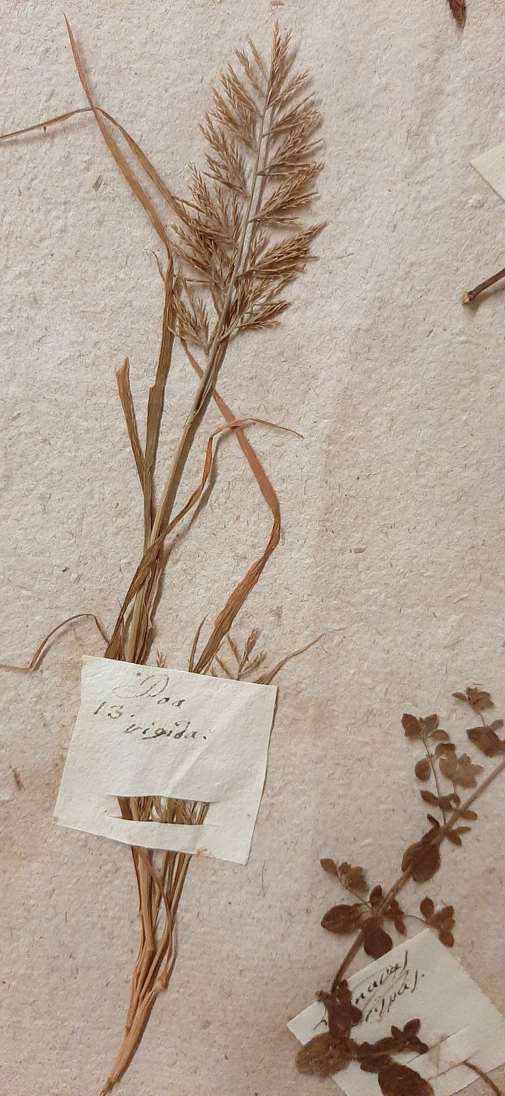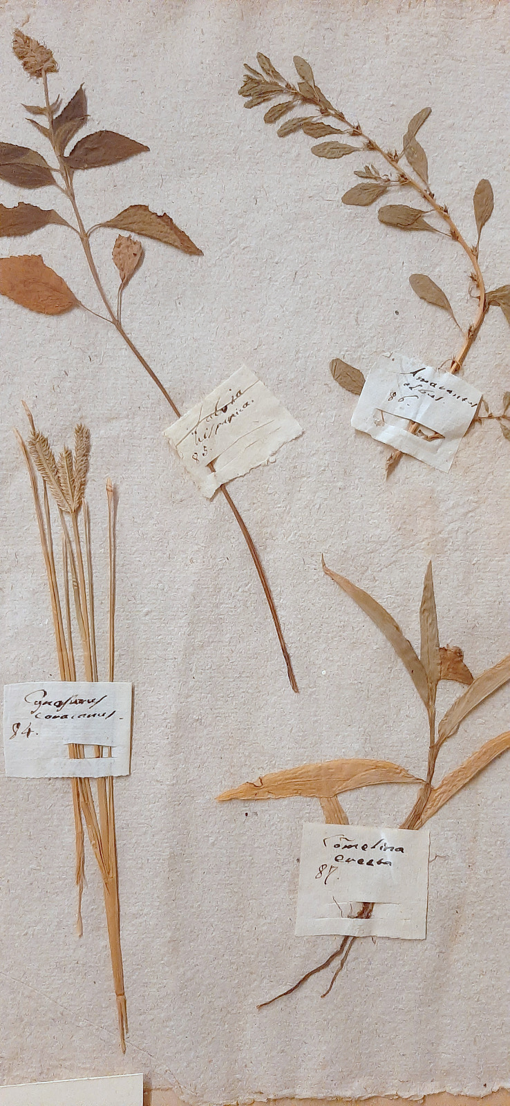 Negli erbari dell’Ottocento le annotazioni botaniche venivano solitamente riportate su fogli di carta vergata o liscia, spesso accompagnate da piccole etichette rettangolari incollate vicino al campione essiccato. In altri casi si utilizzavano cartigli prestampati, soprattutto negli erbari accademici. Su queste etichette venivano indicati in modo ordinato il nome scientifico della pianta, il luogo e la data di raccolta, il nome del raccoglitore e eventuali note sull’habitat. La scrittura era generalmente minuta e molto regolare, così da poter concentrare numerose informazioni in spazi ridotti.