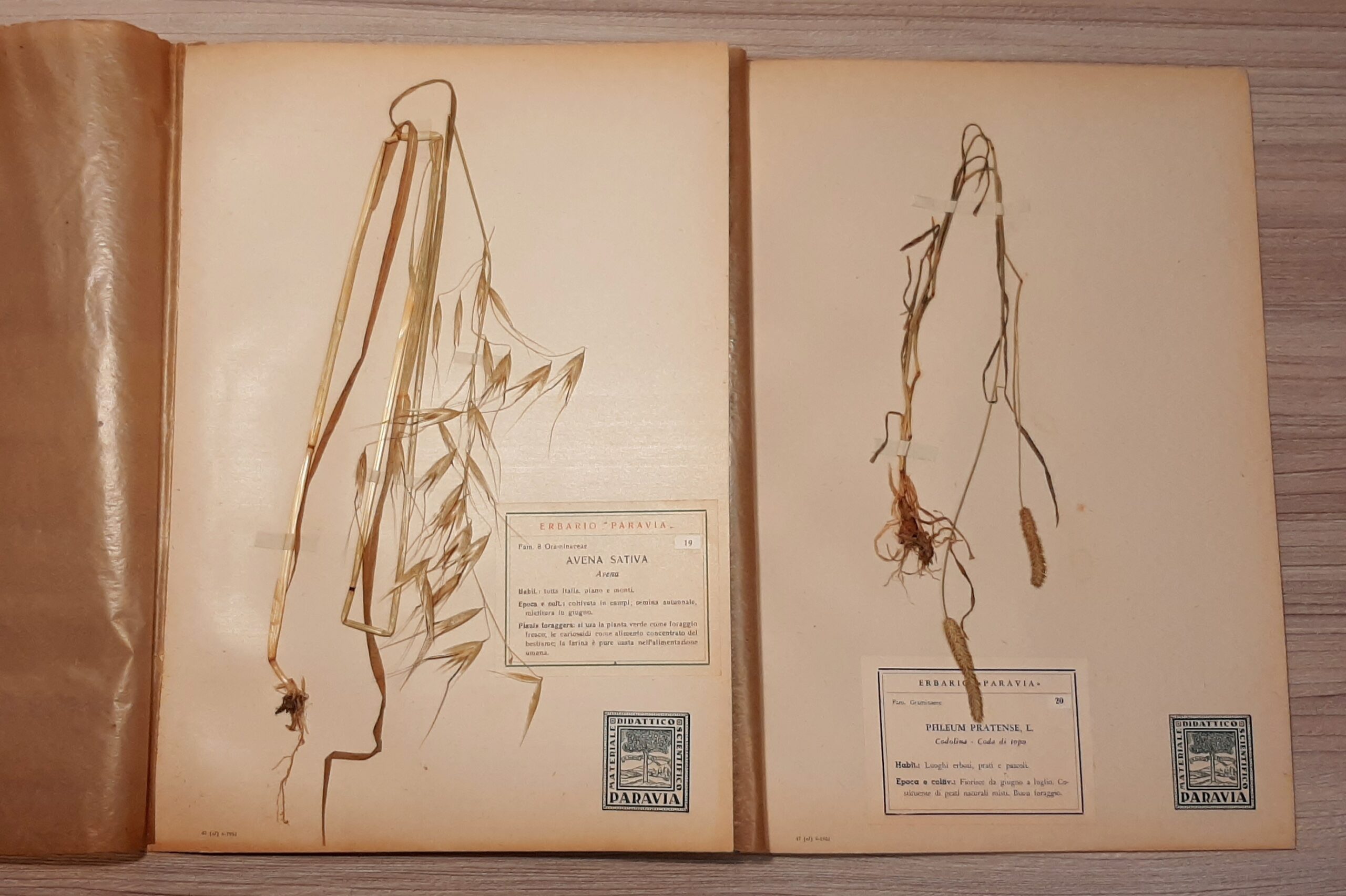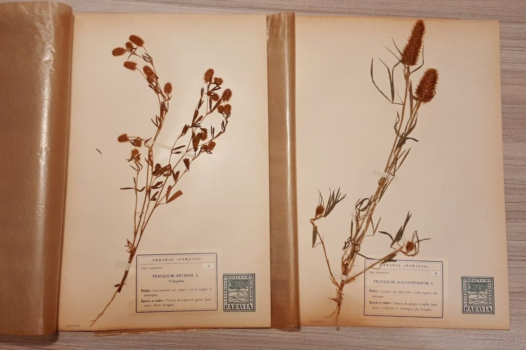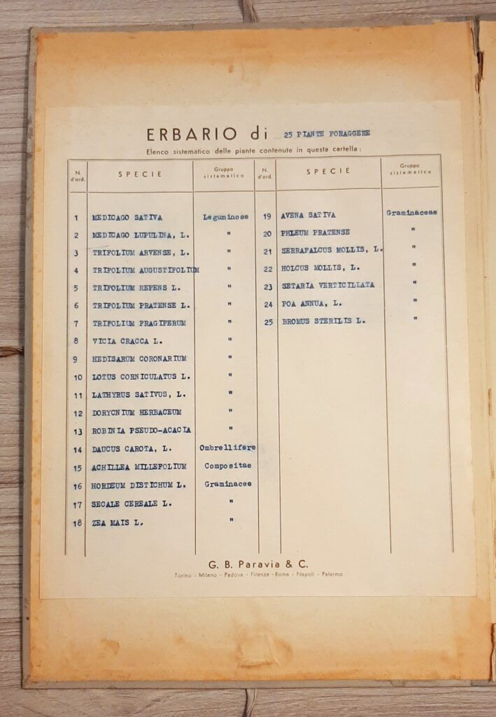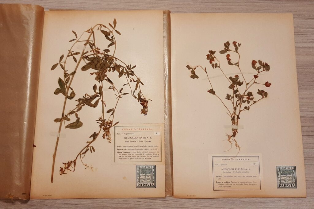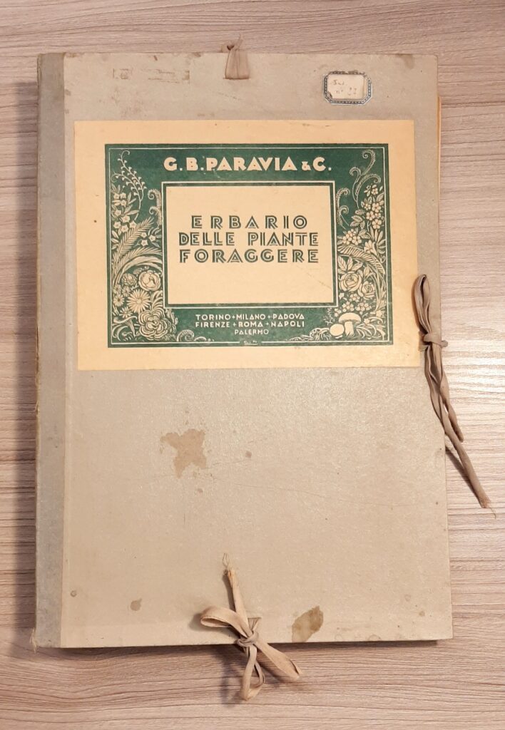 Un’altro interessante pezzo di storia della divulgazione delle scienze rientra nella nostra collezione, quello dell’Erbario delle piante foraggere già venduto nel 1935 sul catalogo CATALOGO DEI SUSSIDI DIDATTICI E DEI LIBRI PER LO STUDIO E LA PROPOGANDA DELL’AGRICOLTURA, a pagina 66 (pagina 76 del pdf), dove viene descritti come: “Erbario foraggero di 25 specie, le più interessanti dei nostri prati, sia spontanee, sia da lungo tempo coltivate, su fogli 36 X 25 in una cartella“.