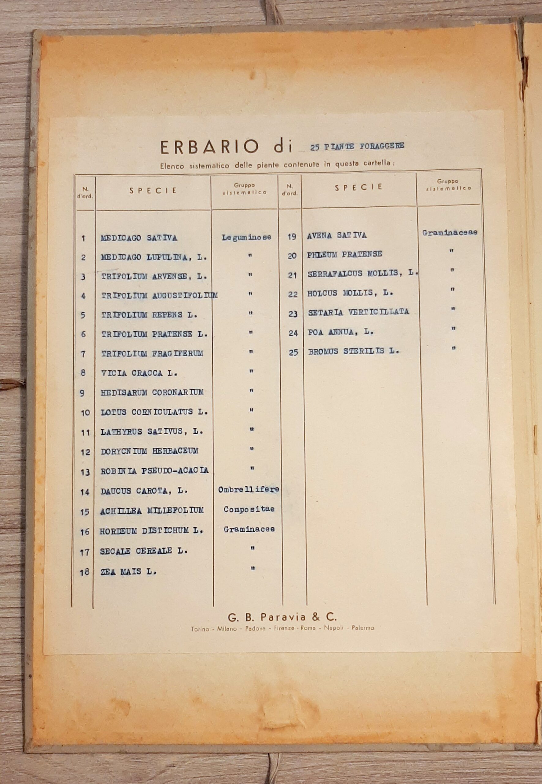 Il documento si inserisce nel contesto della didattica scientifica italiana tra la fine dell’Ottocento e i primi decenni del Novecento, quando lo studio della botanica aveva un ruolo centrale nella formazione scolastica. L’erbario costituiva uno strumento didattico fondamentale, utilizzato soprattutto nelle scuole agrarie, negli istituti tecnici e nelle scuole normali per la formazione dei maestri. L’apprendimento era basato sull’osservazione diretta della natura: gli studenti erano chiamati a raccogliere le piante sul territorio, a essiccarle e a classificarle seguendo criteri scientifici rigorosi. Questo approccio riflette una pedagogia fortemente pratica e sperimentale, nella quale la conoscenza botanica era considerata essenziale sia per la cultura generale sia per le applicazioni agricole. L’elenco standardizzato delle specie foraggere rispondeva all’esigenza di uniformare l’insegnamento su scala nazionale, fornendo agli studenti una base comune di conoscenze utili alla comprensione dell’agricoltura e dell’economia rurale dell’Italia dell’epoca.
