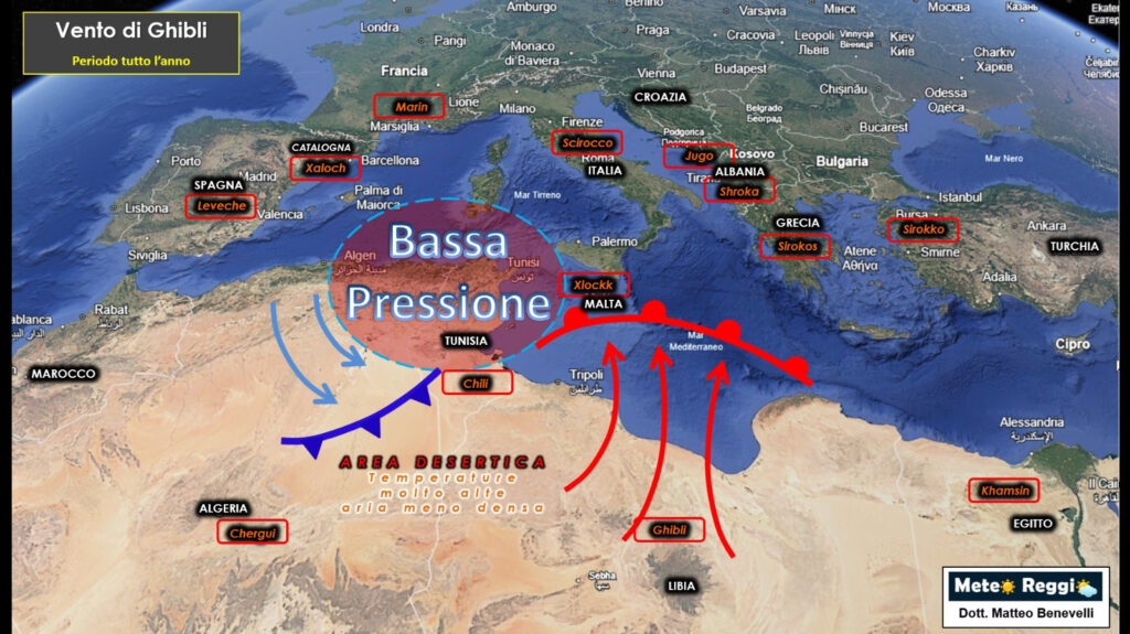 Quindi possiamo immaginare che il vento nasca come Ghibli sul Sahara libico, si diffonda come Khamsin verso l’Egitto e il Levante, e raggiungendo il Mediterraneo diventi uno Scirocco, mentre sul versante occidentale assume il nome Chergui.