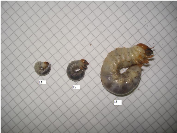 Foto 2: I 3 stadi (L1 – L2 – L3) della larva di cervo volante – Di Bugman95 – Opera propria, CC BY-SA 3.0, https://commons.wikimedia.org/w/index.php?curid=28255340