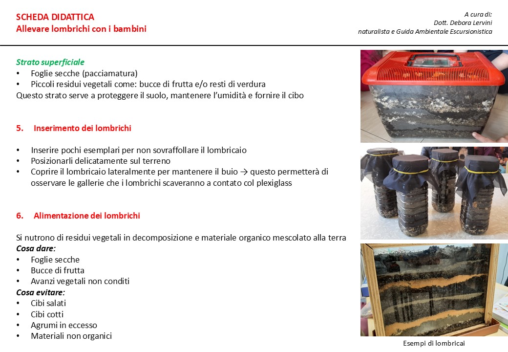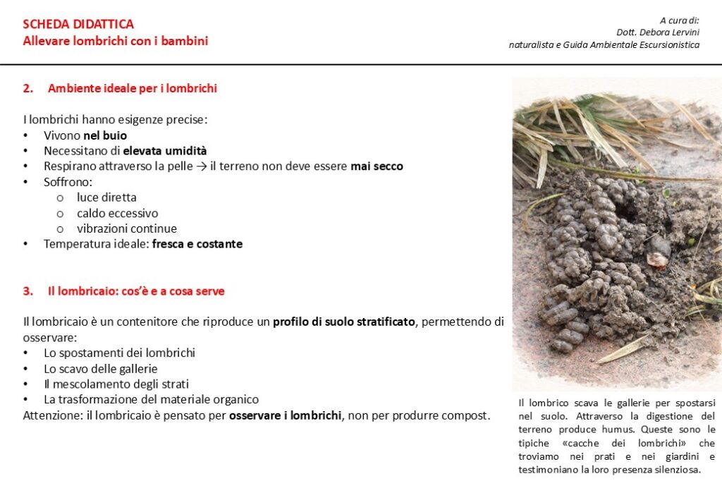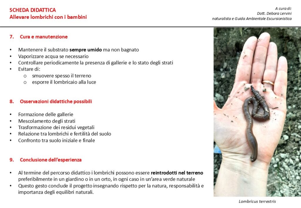 - Al termine del percorso didattico i lombrichi possono essere reintrodotti nel terreno preferibilmente in un giardino o in un orto, in ogni caso in un’area verde naturale